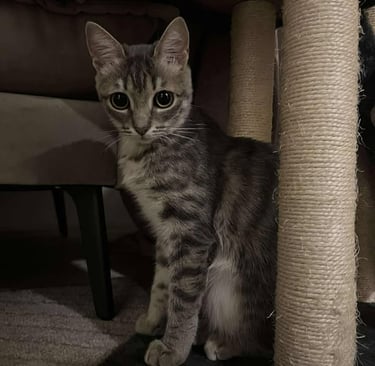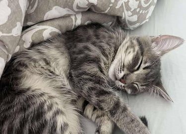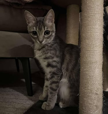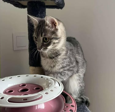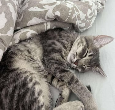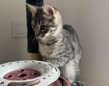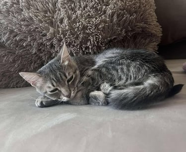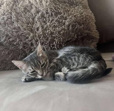 Dabar Megė yra keturių mėnesių amžiaus – švelni, šilta, glaustymus dievinanti katytė.